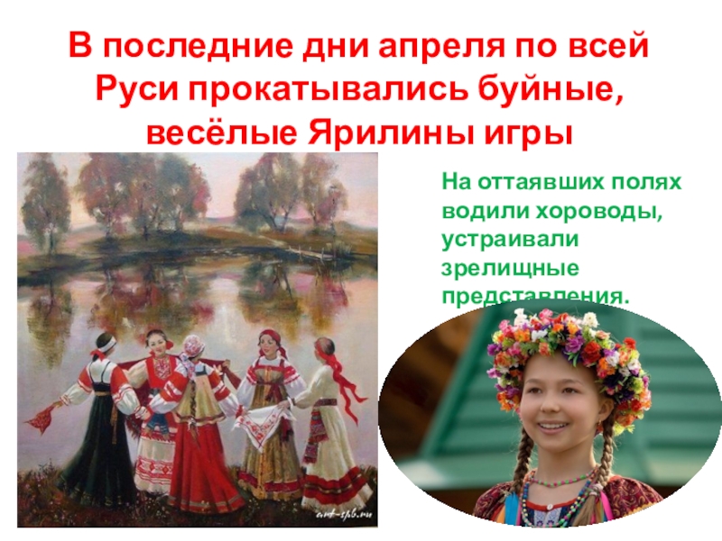 В последние дни апреля по всей Руси прокатывались буйные,весёлые Ярилины игрыНа оттаявших поляхводили хороводы,устраивали зрелищные представления.