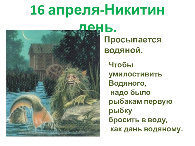 16 апреля-Никитин день.Просыпается водяной.Чтобы умилостивить Водяного, надо былорыбакам первую рыбкубросить в воду, как дань водяному.
