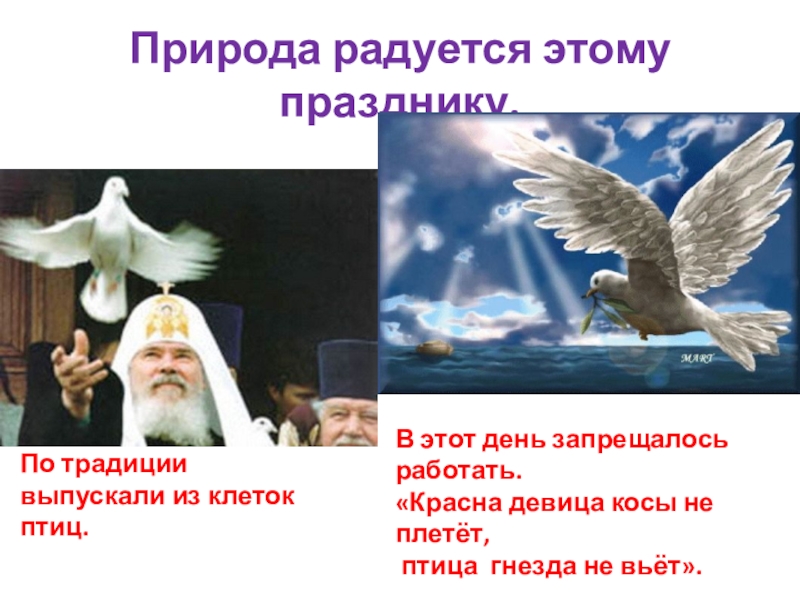 Природа радуется этому празднику.По традиции выпускали из клеток птиц.В этот день запрещалось работать.«Красна девица косы не плетёт,
