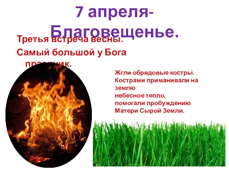 7 апреля-Благовещенье.Третья встреча весны.Самый большой у Бога праздник.Жгли обрядовые костры.Кострами приманивали на землюнебесное тепло, помогали пробуждению Матери