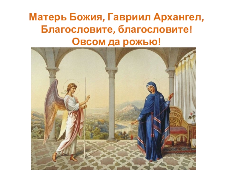 Слайд 10Матерь Божия, Гавриил Архангел, Благословите, благословите! Овсом да рожью!