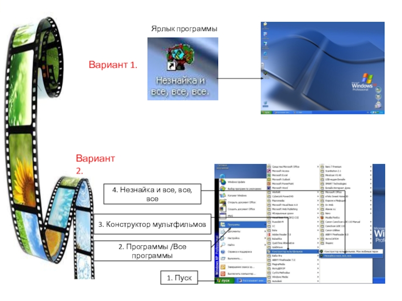 Ярлык программыВариант 1.2. Программы /Все программы1. Пуск3. Конструктор мультфильмов4. Незнайка и все, все, всеВариант 2.