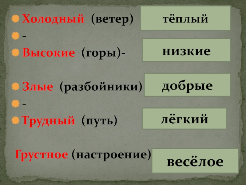 Холодный (ветер)-Высокие (горы)-Злые (разбойники)-Трудный (путь)Грустное (настроение)тёплыйнизкие добрыелёгкийвесёлое