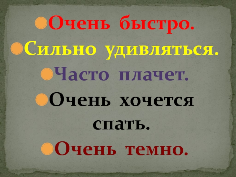 Очень быстро.Сильно удивляться.Часто плачет.Очень хочется  спать.Очень темно.