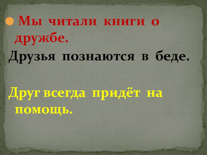 Мы читали книги о  дружбе.Друзья познаются в беде.Друг всегда придёт на помощь.