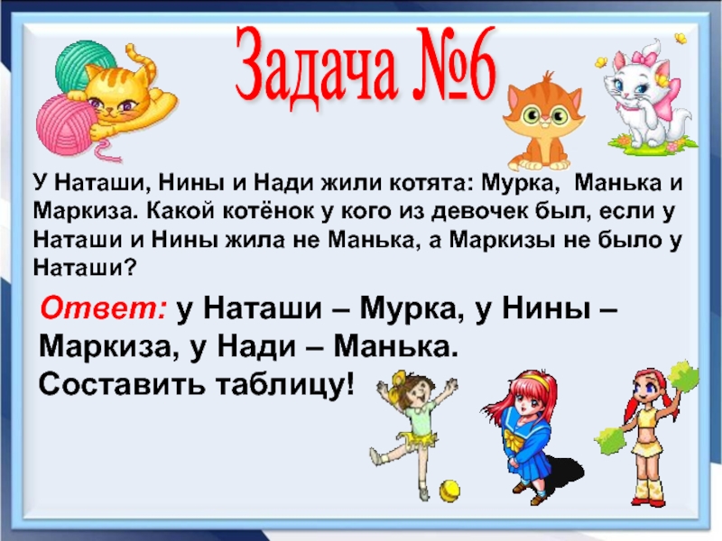 Ответ: у Наташи – Мурка, у Нины – Маркиза, у Нади – Манька.