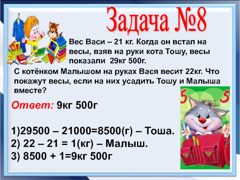 С котёнком Малышом на руках Вася весит 22кг. Что покажут весы, если на них усадить Тошу и Малыша вместе?