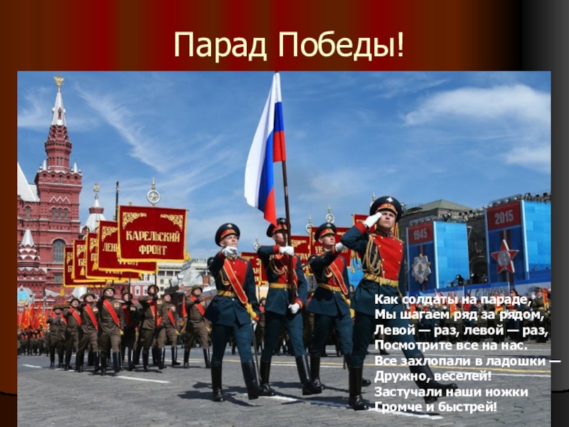 Парад Победы!Как солдаты на параде, Мы шагаем ряд за рядом, Левой — раз, левой — раз, Посмотрите