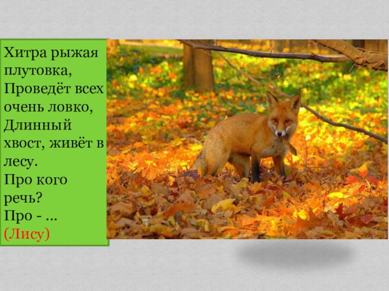 Хитра рыжая плутовка, Проведёт всех очень ловко,Длинныйхвост, живёт в лесу.Про кого речь?  Про - ... (Лису)