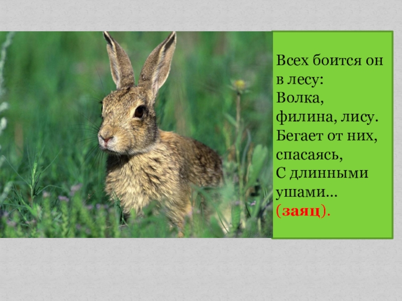 Слайд 4Всех боится он в лесу: Волка, филина, лису. Бегает от них, спасаясь, С длинными