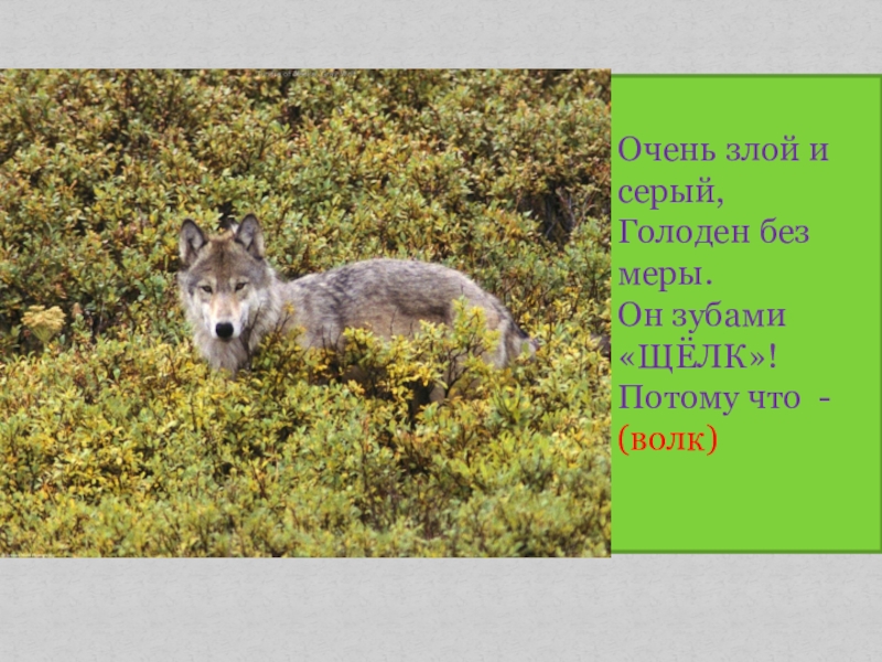 Очень злой и серый,Голоден без меры.Он зубами «ЩЁЛК»!Потому что  - (волк)