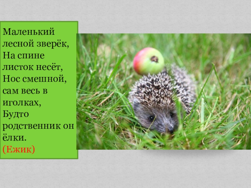 Маленький лесной зверёк, На спине листок несёт, Нос смешной, сам весь в иголках, Будто родственник он ёлки.