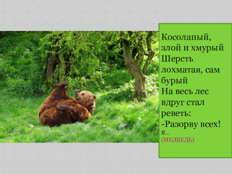 Косолапый, злой и хмурыйШерсть лохматая, сам бурыйНа весь лес вдруг стал реветь:-Разорву всех! Я…