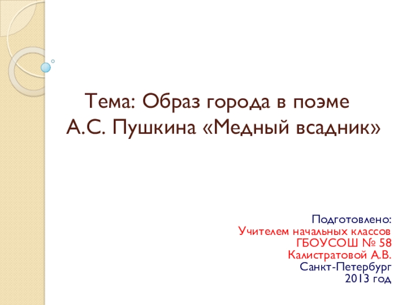 Тема: Образ города в поэме  А.С. Пушкина «Медный всадник»Подготовлено: Учителем начальных классов ГБОУСОШ №