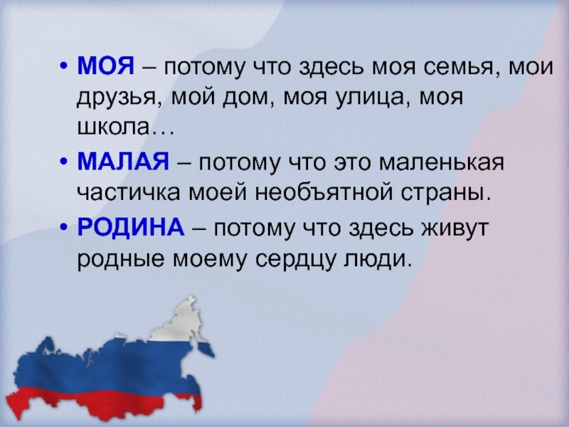 МОЯ – потому что здесь моя семья, мои друзья, мой дом, моя улица, моя школа…МАЛАЯ – потому