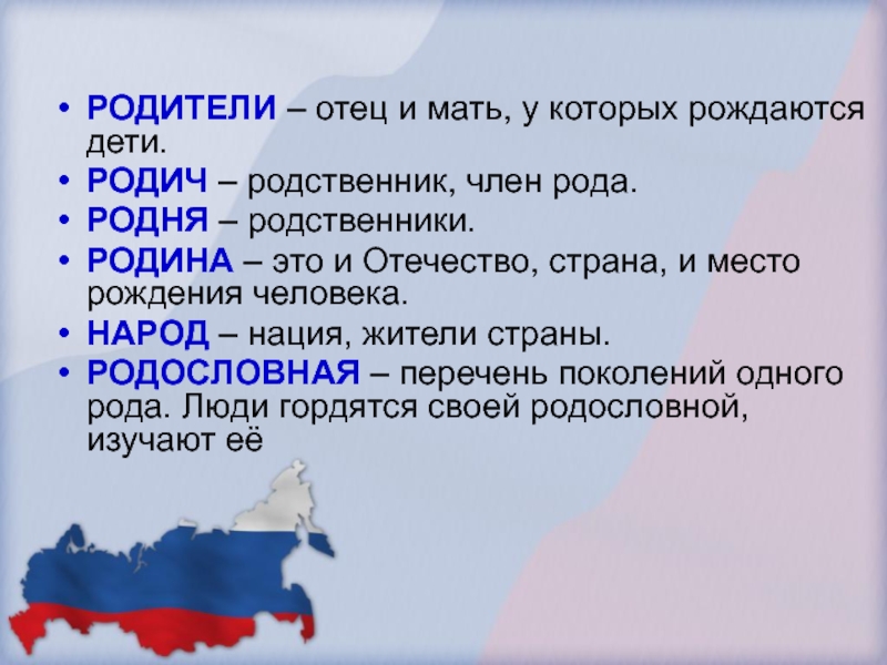 РОДИТЕЛИ – отец и мать, у которых рождаются дети. РОДИЧ – родственник, член рода.РОДНЯ – родственники.РОДИНА –
