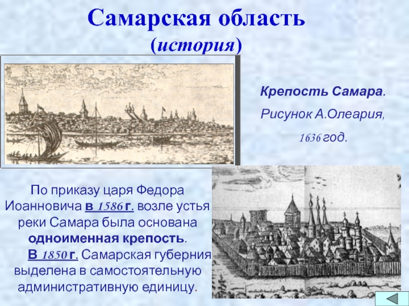 Самарская область (история) Крепость Самара. Рисунок А.Олеария, 1636 год. По приказу царя Федора Иоанновича в 1586 г.
