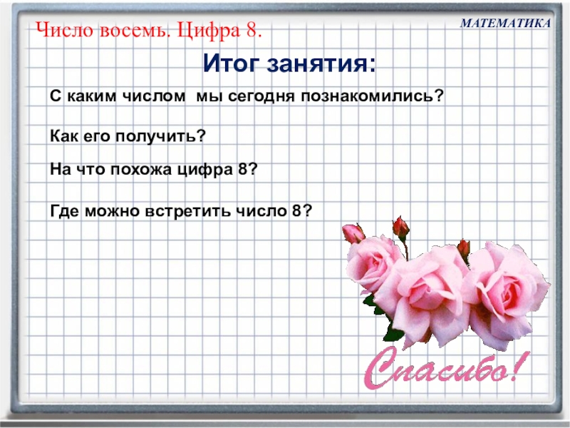 Число восемь записывают знаком - цифрой 8.