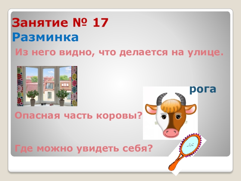 Занятие № 17 РазминкаИз него видно, что делается на улице.Опасная часть коровы?Где можно увидеть себя?рога