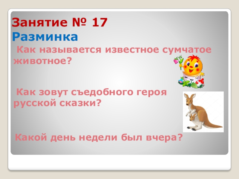 Занятие № 17 РазминкаКак называется известное сумчатое животное?Как зовут съедобного героя русской сказки?Какой день недели был вчера?