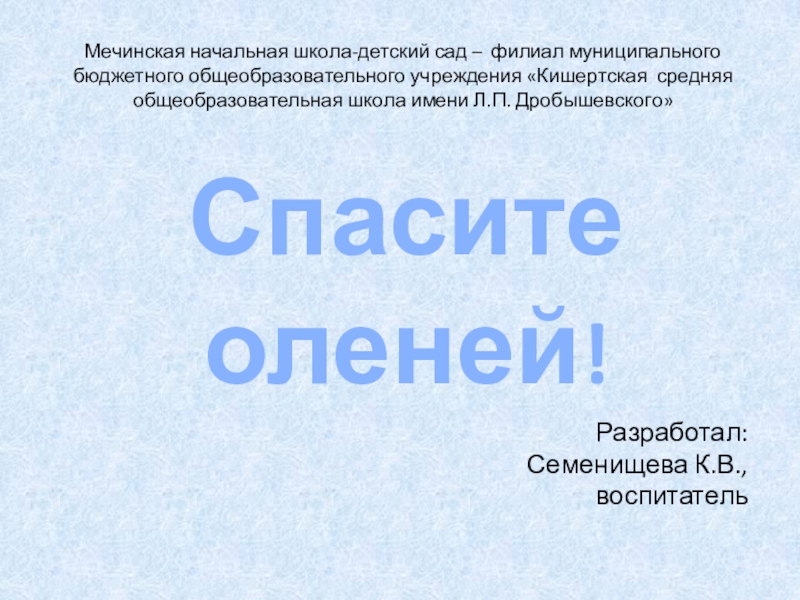 Разработал:Семенищева К.В.,воспитательСпасите оленей!Мечинская начальная школа-детский сад – филиал муниципального бюджетного общеобразовательного учреждения «Кишертская средняя общеобразовательная школа имени