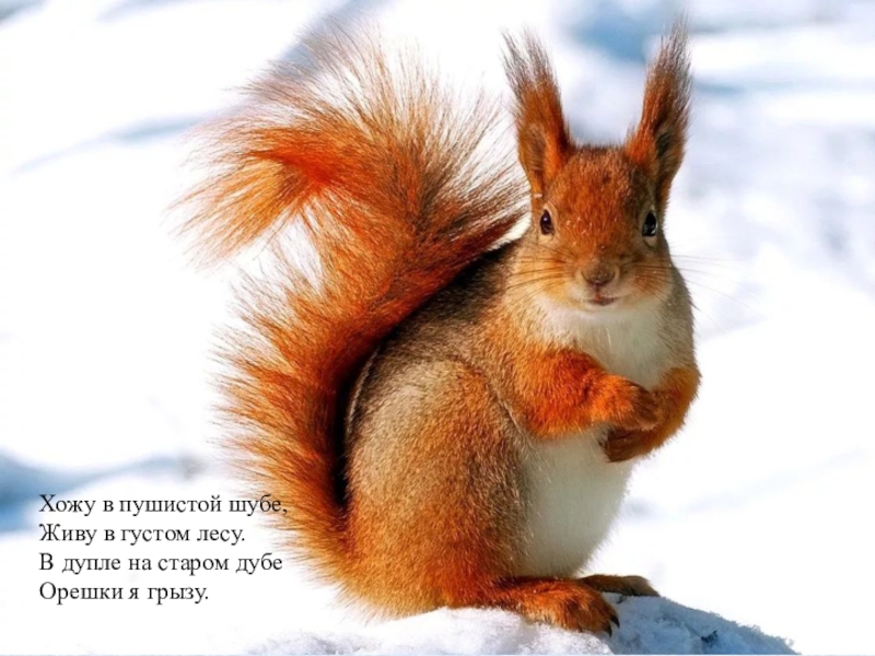 Хожу в пушистой шубе,Живу в густом лесу.В дупле на старом дубеОрешки я грызу.