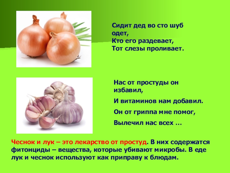 Чеснок и лук – это лекарство от простуд. В них содержатся фитонциды – вещества, которые убивают микробы. В еде лук и чеснок используют как приправу к блюдам.