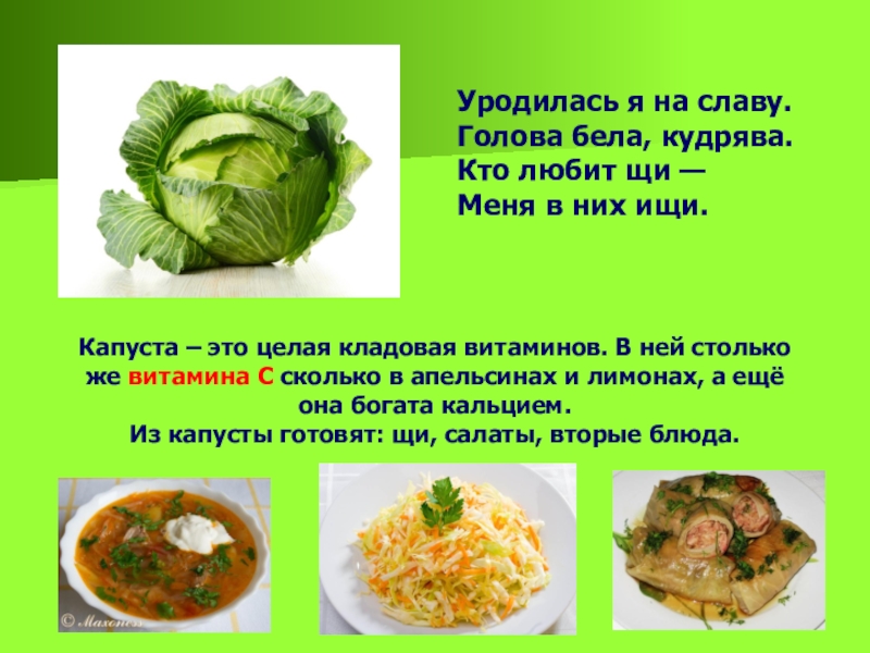 Капуста – это целая кладовая витаминов. В ней столько же витамина С сколько в апельсинах и лимонах, а ещё она богата кальцием.