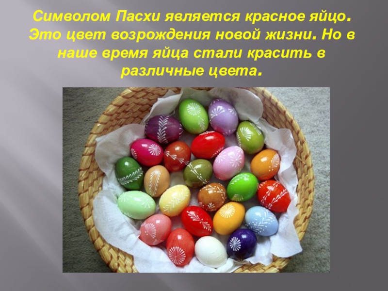 Слайд 7Символом Пасхи является красное яйцо. Это цвет возрождения новой жизни. Но