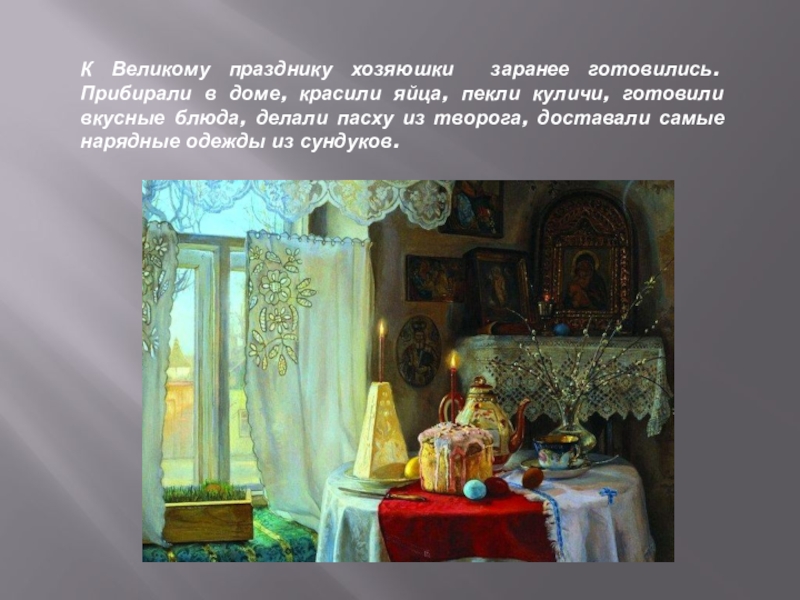 Слайд 5К Великому празднику хозяюшки заранее готовились. Прибирали в доме, красили яйца,