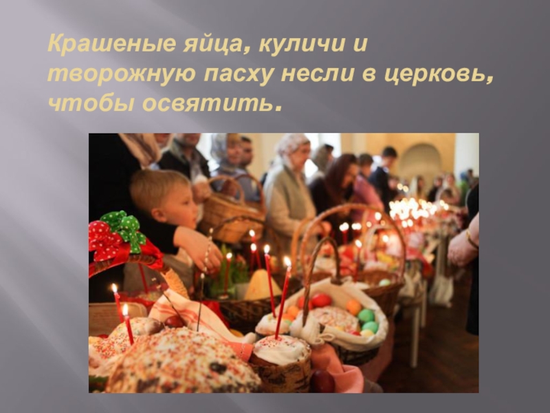 Слайд 6Крашеные яйца, куличи и творожную пасху несли в церковь, чтобы освятить.