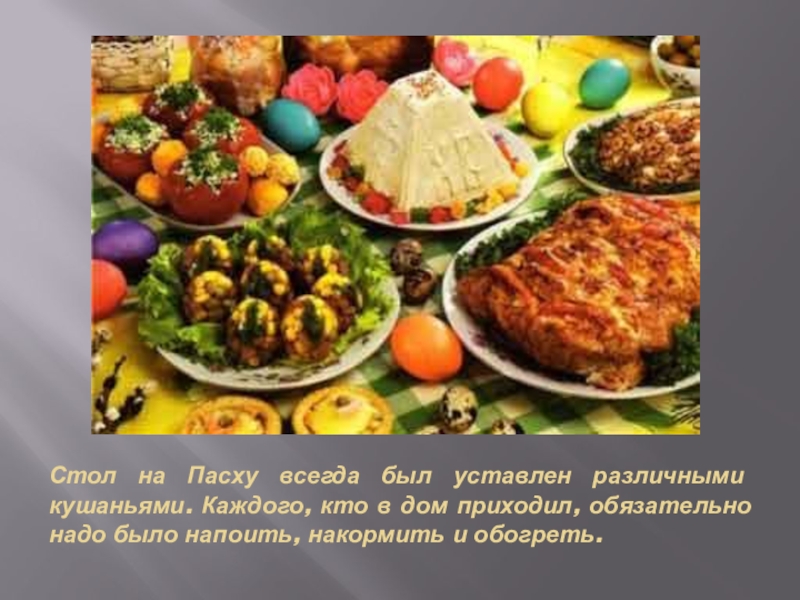 Слайд 9Стол на Пасху всегда был уставлен различными кушаньями. Каждого, кто в