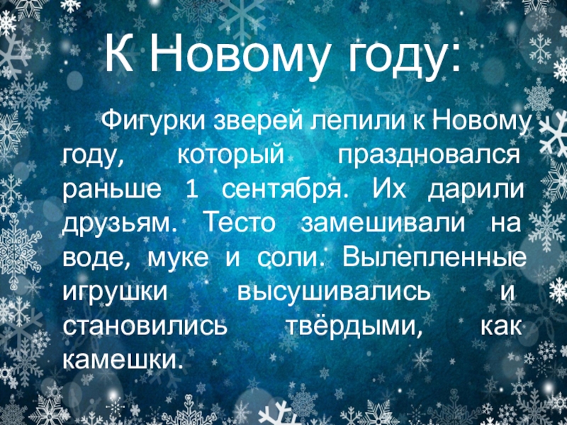 К Новому году:   Фигурки зверей лепили к Новому году, который праздновался раньше 1 сентября. Их