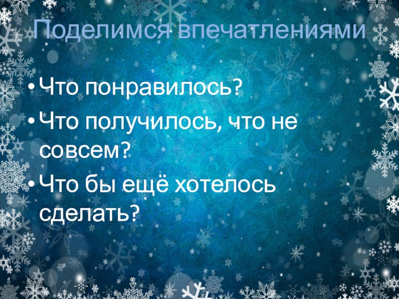 Поделимся впечатлениями Что понравилось?Что получилось, что не совсем?Что бы ещё хотелось сделать?