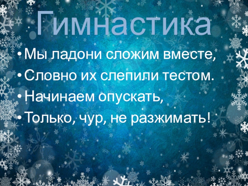 ГимнастикаМы ладони сложим вместе,Словно их слепили тестом.Начинаем опускать,Только, чур, не разжимать!