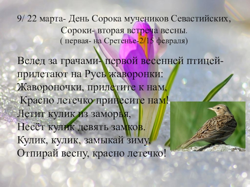 Вслед за грачами- первой весенней птицей- прилетают на Русь жаворонки: