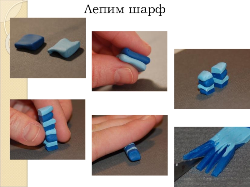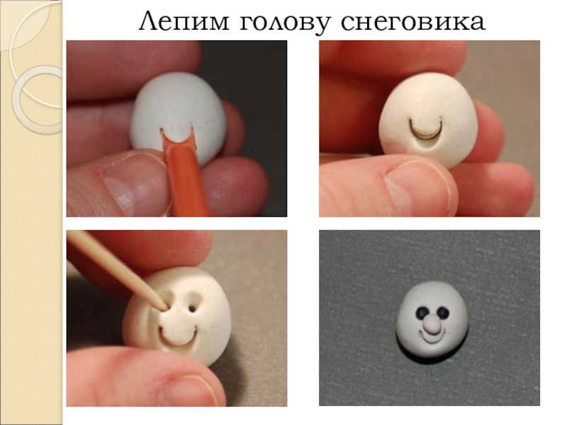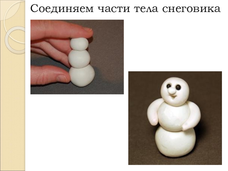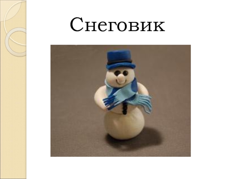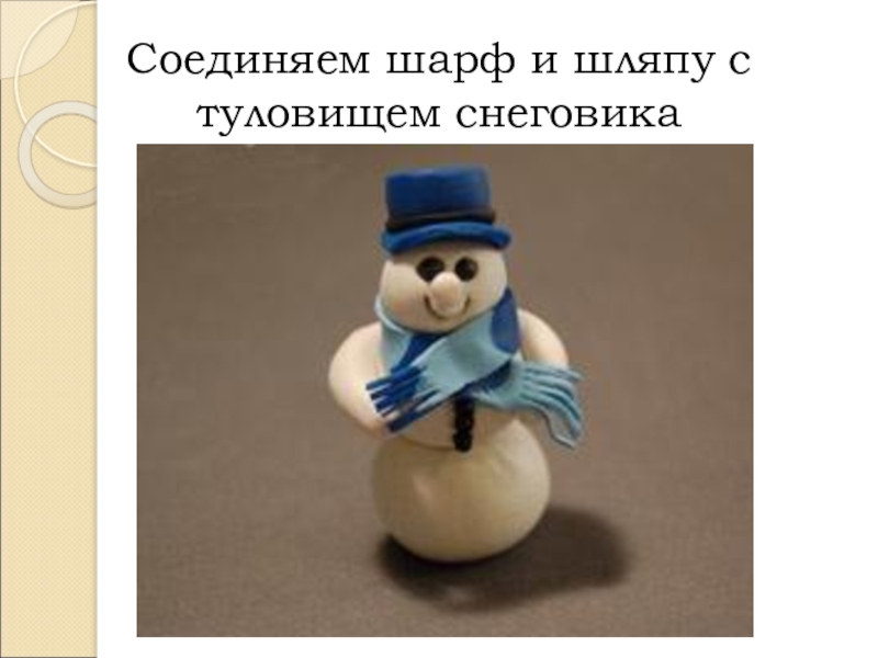 снеговик белый, голова, туловище, руки, тело, шляпа синяя, шарф, размять, мягкий, слепить, прилепить, шарик из пластилина, маленький кусочек.
