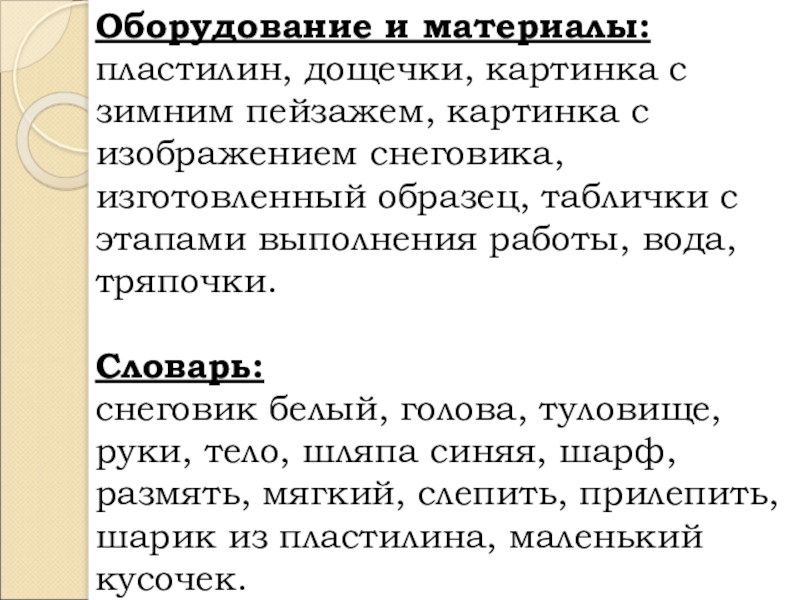 Оборудование и материалы:пластилин, дощечки, картинка с зимним пейзажем, картинка с изображением снеговика, изготовленный образец, таблички с