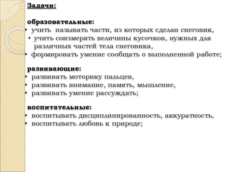Задачи:образовательные: учить называть части, из которых сделан снеговик,учить соизмерять величины кусочков, нужных для различных частей тела снеговика, формировать умение сообщать о выполненной работе;развивающие: развивать моторику пальцев, развивать внимание, память, мышление, развивать умение рассуждать;воспитательные: