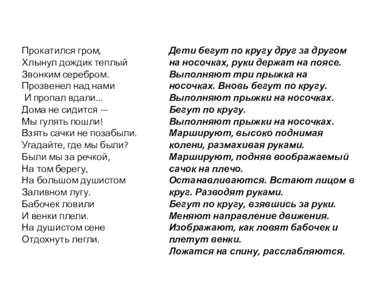 Дети бегут по кругу друг за другом на носочках, руки держат на поясе. Выполняют три прыжка на носочках. Вновь бегут по кругу.
