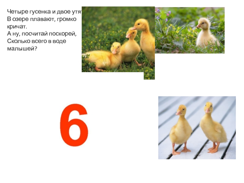 Четыре гусенка и двое утятВ озере плавают, громко кричат.А ну, посчитай поскорей,Сколько всего в воде малышей?