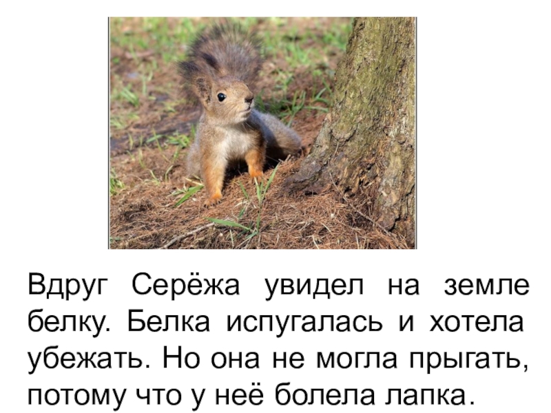 Слайд 5Вдруг Серёжа увидел на земле белку. Белка испугалась и хотела убежать.