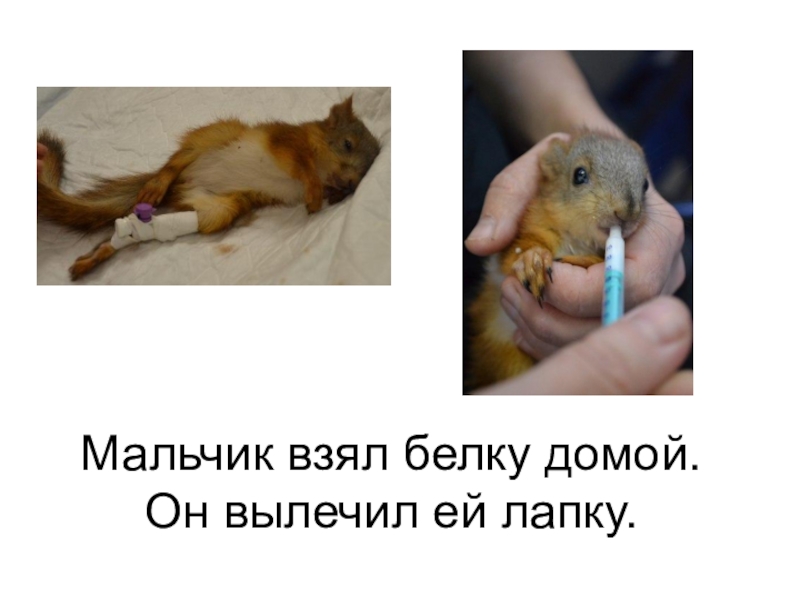 Слайд 6Мальчик взял белку домой. Он вылечил ей лапку.