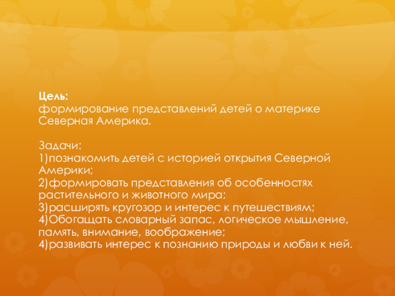 Цель: формирование представлений детей о материке Северная Америка.   Задачи: 1)познакомить детей с историей открытия Северной Америки; 2)формировать представления об особенностях растительного и животного мира; 3)расширять кругозор и интерес к путешествиям; 4)Обогащать словарный запас,