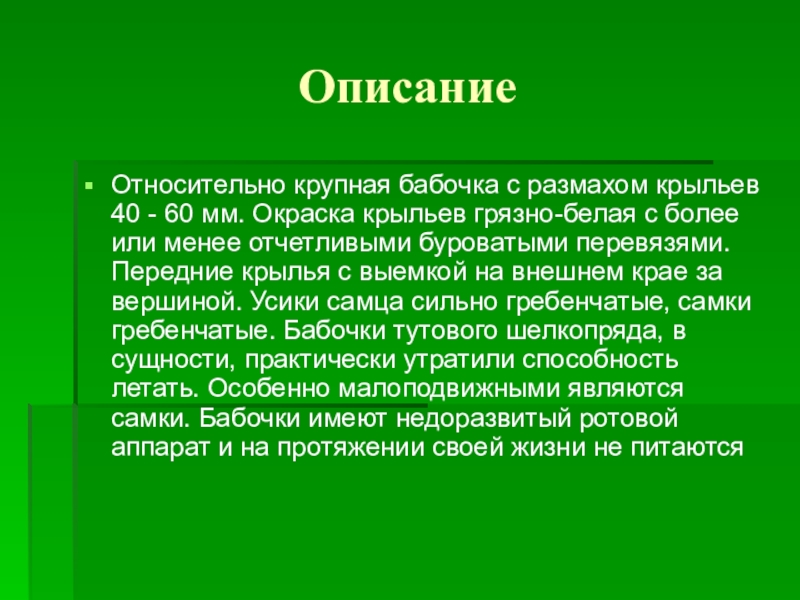 которого — наличие густого покрова хитиновых чешуек (уплощённых волосков) на передних и задних крыльях (при этом чешуйки расположены как на жилках, так и на Крыловой пластинке между ними). Для большинства видов характерен специализированный сосущий ротовой аппарат с хоботком, образованным удлинёнными лопастями нижней челюсти. Форма и размах крыльев весьма разнообразны: от 2 мм до 30,8 см.