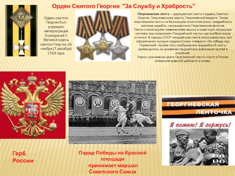 Лента с некоторыми изменениями вошла в советскую наградную систему под названием «Гвардейской ленты» как особого знака отличия. В период СССР гвардейская лента использовалась при оформлении колодки ордена Славы и медали «За победу над Германией». Кроме того, изображение гвардейской ленты размещалось на знамёнах гвардейских войсковых частей и кораблей.
