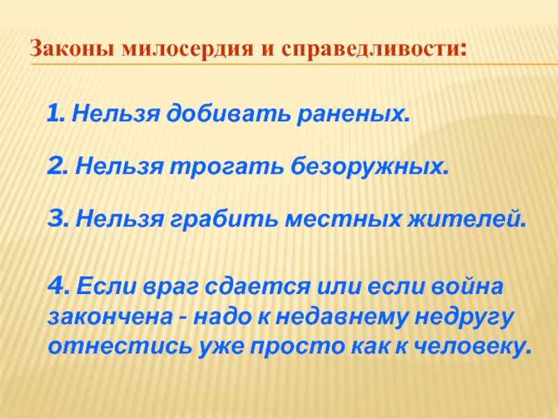 4. Если враг сдается или если война закончена - надо к недавнему недругу отнестись уже просто как к человеку.