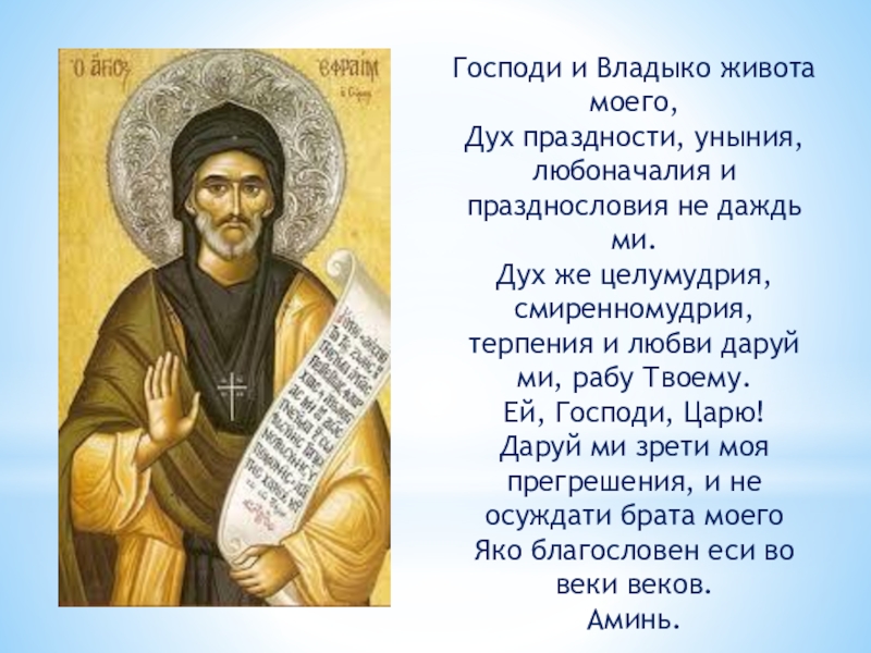 Господи и Владыко живота моего,Дух праздности, уныния, любоначалия и празднословия не даждь ми.Дух же целумудрия, смиренномудрия, терпения