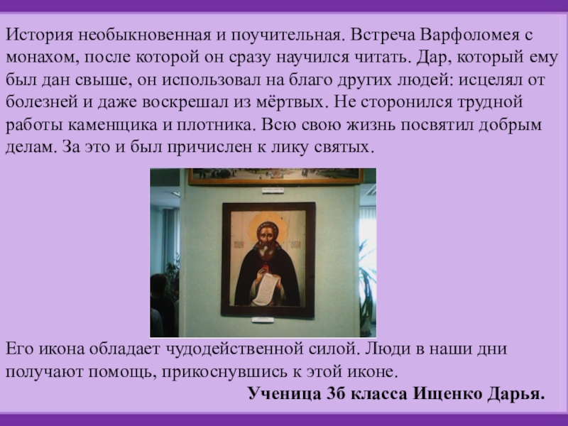 Его икона обладает чудодейственной силой. Люди в наши дни получают помощь, прикоснувшись к этой иконе.