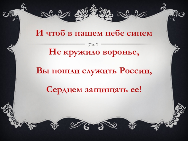 И чтоб в нашем небе синемНе кружило воронье,Вы пошли служить России,Сердцем защищать ее!